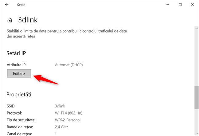 Pe pagina de detalii a acelei conexiuni, derulează până găsești secțiunea Setări IP și apoi apasă pe butonul Editare. Este singurul buton de acolo, așa că nu ai cum să-l ratezi.