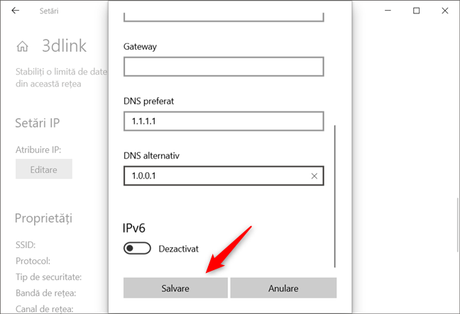 Derulează în jos până găsești câmpurile DNS preferat și DNS alternativ. Acesta este locul unde poți specifica cele două servere DNS pe care vrei să le folosești pentru conexiunea de rețea. În câmpul DNS preferat, tastează adresa IP a serverului DNS pe care îl vrei să îl folosești și, dacă vrei, scrie și o opțiune de rezervă în câmpul DNS alternativ. În captura următoare de ecran, poți vedea că noi am ales să folosim serverele DNS publice oferite de Cloudflare.